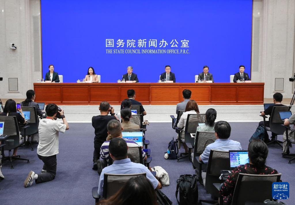 7月4日,国务院新闻办公室在北京举行国务院政策例行吹风会,商务部部长助理唐文弘,上海市委常委、常务副市长吴伟和商务部自贸区港建设协调司司长孟华婷,中国人民银行研究局负责人纪敏,海关总署自贸区和特殊区域发展司负责人杜朝新介绍中国(上海)自由贸易试验区全面对接国际高标准经贸规则试点成效及复制推广有关情况,并答记者问。新华社发(刘健 摄)
