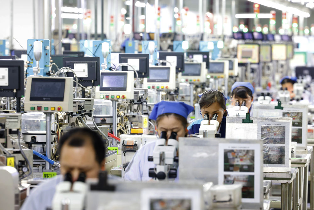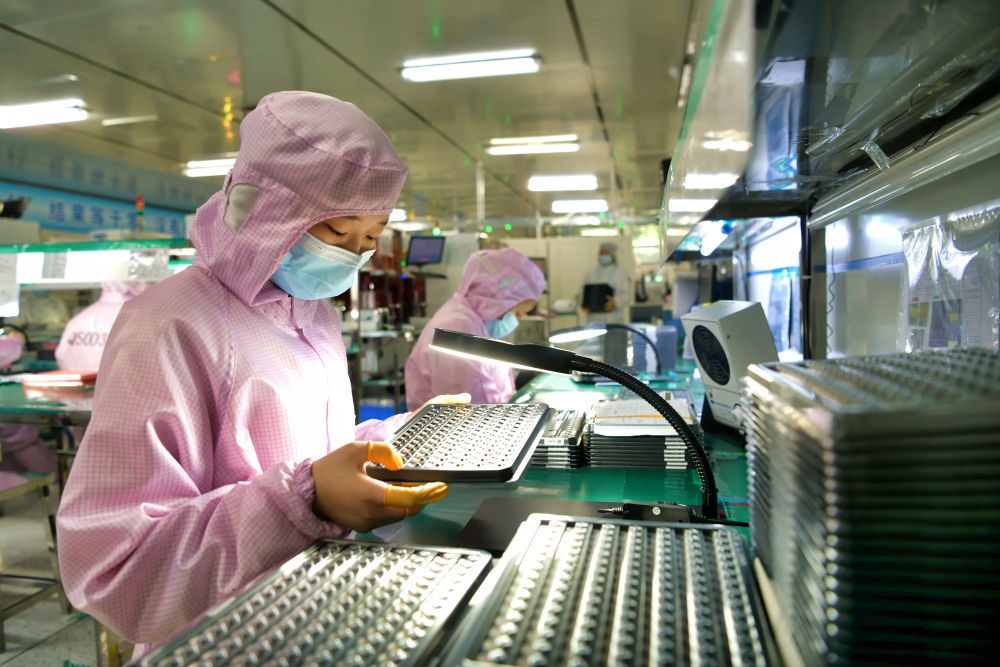 6月24日,在江苏宿迁泗洪经济开发区庆邦电子元器件(泗洪)有限公司车间内,工人加紧赶制出口的电子订单产品。新华社发(许昌亮摄)