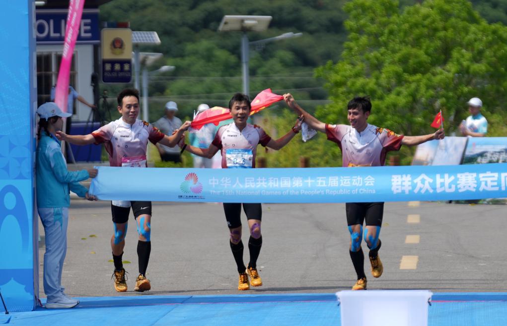 5月8日,广东队选手李卓业(中)、唐建达(左)、唐潇在男子定向接力赛中冲向终点。当日,第十五届全国运动会群众赛事活动定向接力赛决赛在广东省茂名市高州根子镇举行。新华社记者 黄国保 摄