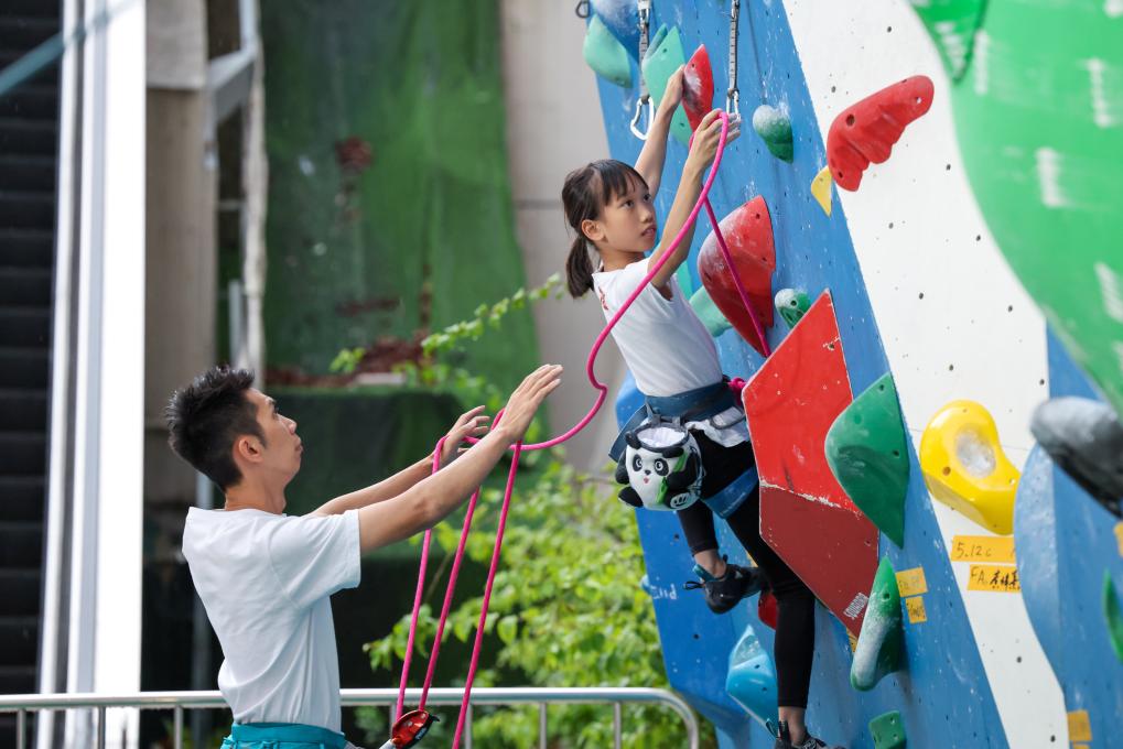 图为在深圳福田区呢度有家攀岩馆,来自中国香港的9岁女孩何芊芊(右)在爸爸何善挥的保护下开始难度攀岩训练(6月17日摄)。新华社记者 梁旭 摄