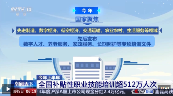 今年1至6月,全国完成补贴性职业技能培训超512万人次,新增取得高级工及以上职业资格证书或职业技能等级证书185.1万人次,其中技师及以上13.3万人次。