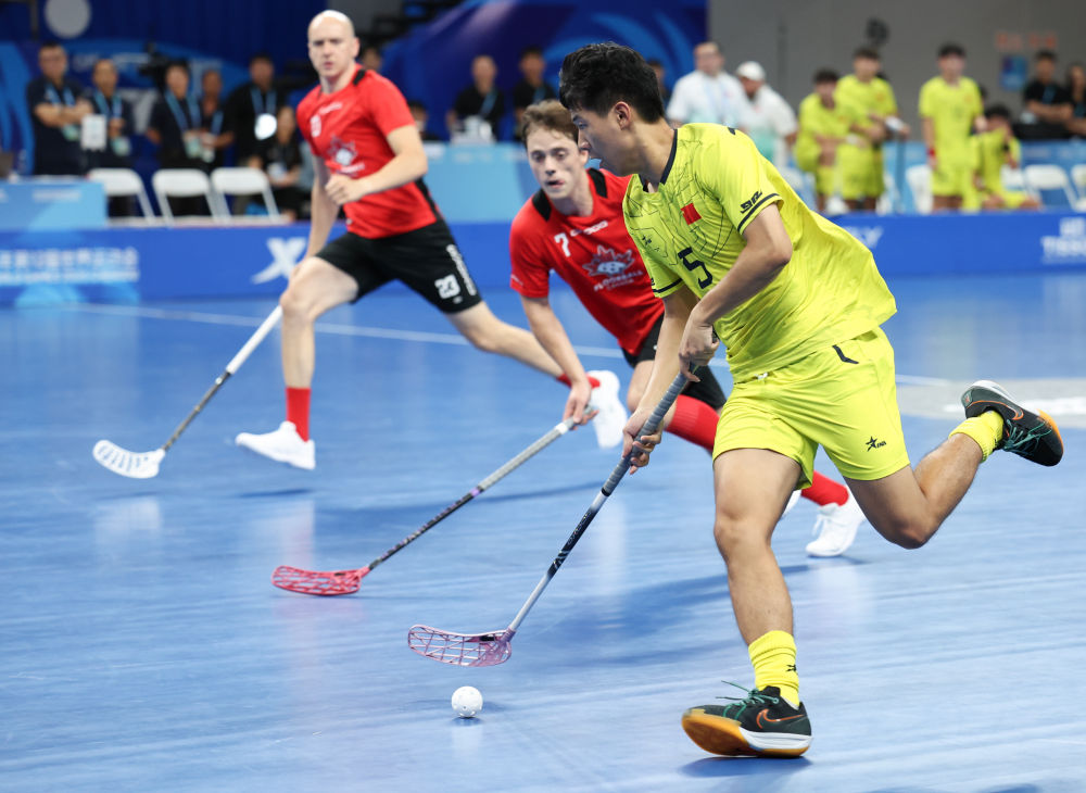 8月10日,中国队球员张志恒(前)在比赛中带球进攻。当日,在2025年成都世运会软式曲棍球男子B组预赛中,中国队不敌加拿大队。新华社记者 梁旭 摄