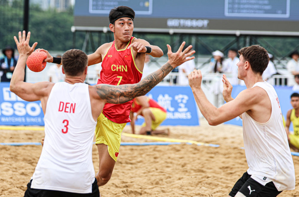 8月11日,中国队球员任健豪(上)在比赛中进攻。当日,在2025年成都世运会沙滩手球男子第5-8名安慰赛半决赛中,中国队0比2不敌丹麦队。新华社记者 刘坤 摄