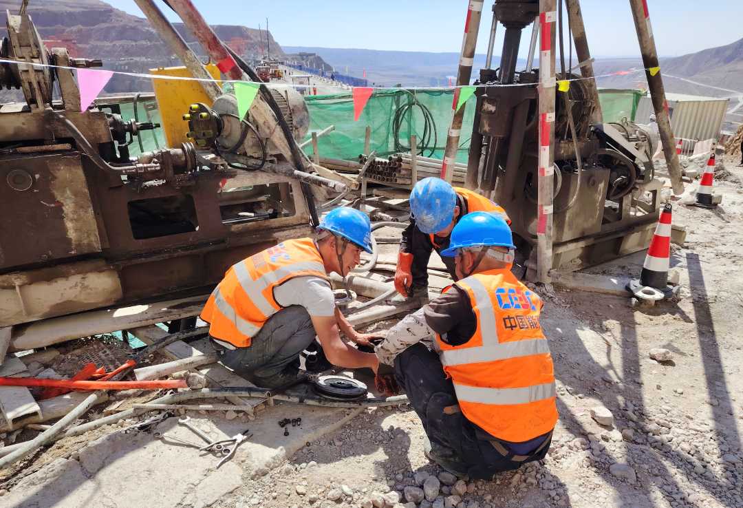 大石峡水利枢纽工程大坝右岸,工人正在1707米的海拔高度上维修灌浆设备。刘沛恺摄