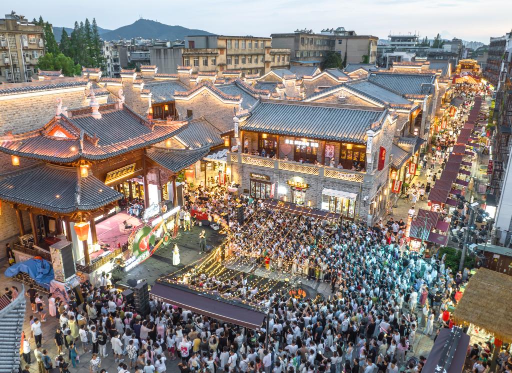 7月25日,游客在湖北省襄阳古城管家巷文化休闲街区观看星光音乐会(无人机照片)。新华社发(杨东摄)