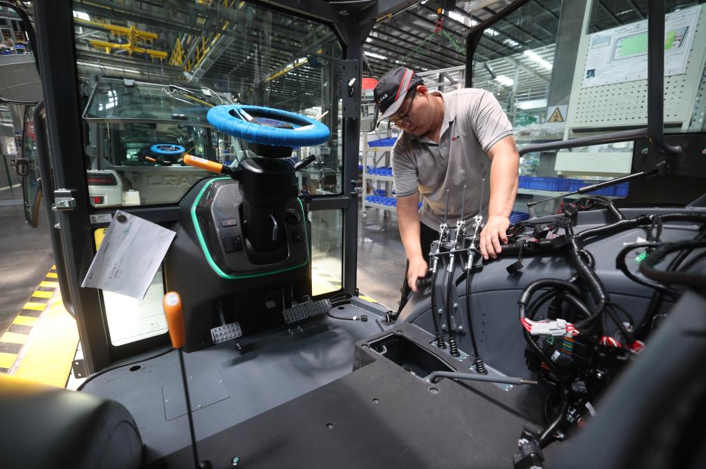 7月27日,工人在山东省临沂市兰山区临工智慧农机装备产业园的流水线上组装拖拉机。新华社发(王彦冰摄)