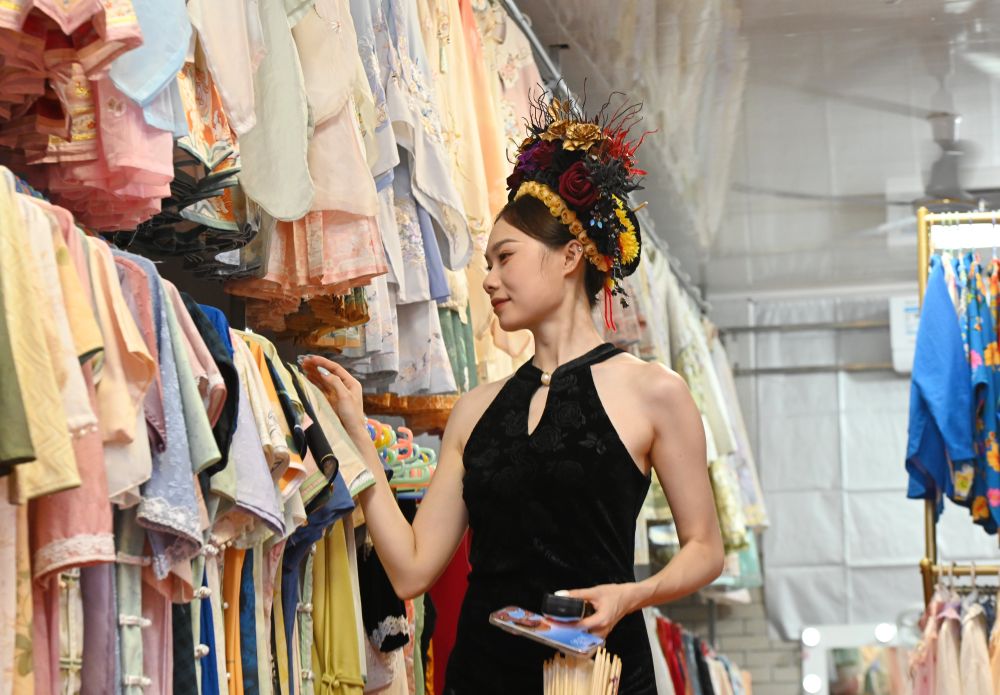 8月18日,来自广州的游客在泉州市蟳埔村出租“簪花围”的服饰店里参观。