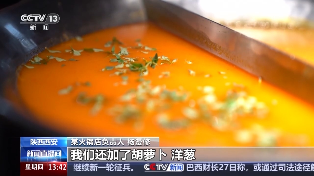 某火锅店负责人 杨漫修:我们这个番茄锅更像是西餐里面的番茄浓汤,比如说我们在做料的时候除了番茄以外,我们还加了胡萝卜、洋葱、欧芹、百里香。