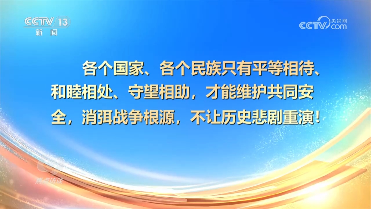 央视网消息(焦点访谈):9月3日上午,纪念中国人民抗日战争暨世界反法西斯战争胜利80周年大会在北京隆重举行。我们以盛大阅兵仪式,同世界人民一道纪念这个伟大的日子。同日,纪念中国人民抗日战争暨世界反法西斯战争胜利80周年招待会在人民大会堂隆重举行。在这些纪念活动中,习近平总书记发表一系列重要讲话,强调要铭记历史、缅怀先烈、珍爱和平、开创未来。
