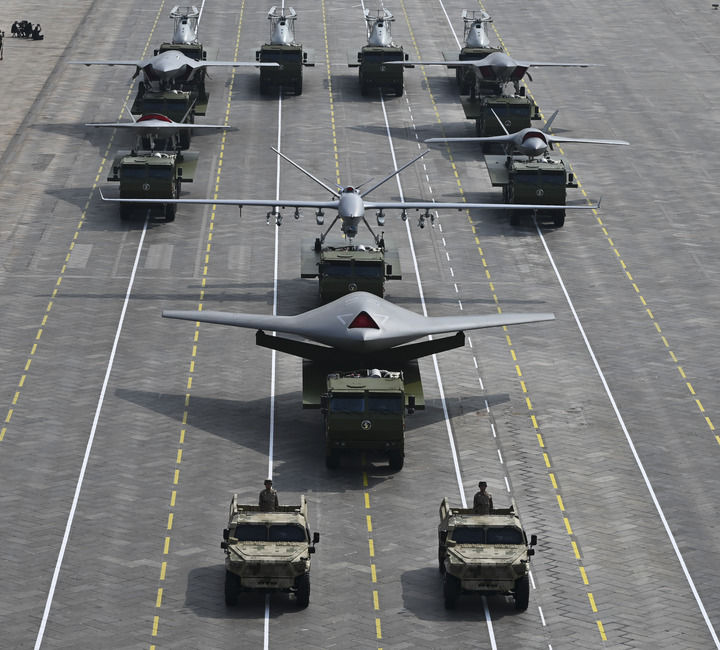 ↑9月3日,纪念中国人民抗日战争暨世界反法西斯战争胜利80周年大会在北京隆重举行。这是空中无人作战方队接受检阅。