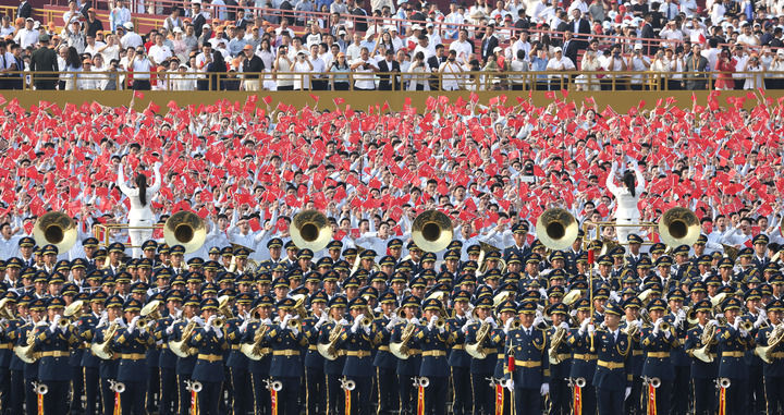 ↑9月3日,纪念中国人民抗日战争暨世界反法西斯战争胜利80周年大会在北京隆重举行。这是中国人民解放军联合军乐团和合唱团。新华社记者 刘卫兵 摄