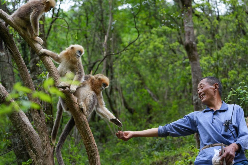 5月21日,巡护员徐庭友在巡护路上遇到几只小川金丝猴,喂金丝猴吃花生。
