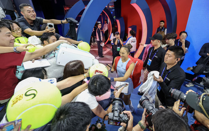 9月27日,在北京举行的2025中国网球公开赛女单第二轮与哥伦比亚选手阿朗戈的比赛后,中国选手郑钦文(中)与观众互动。新华社记者 白雪飞 摄