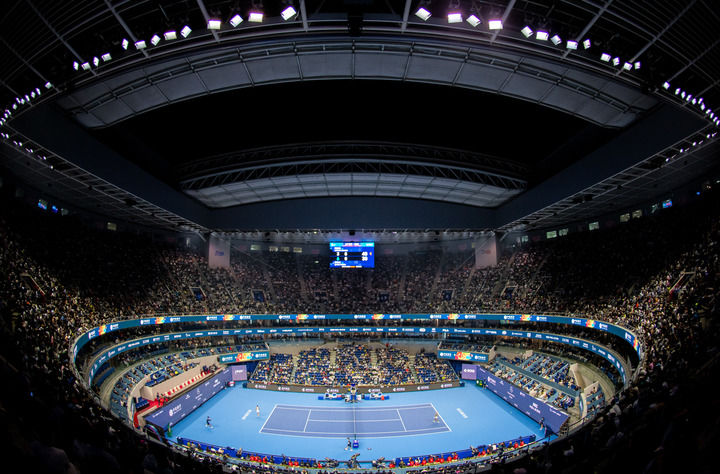 10月1日,中国网球公开赛期间,球迷在国家网球中心内的大屏前观看比赛。新华社记者 杜昕怡 摄