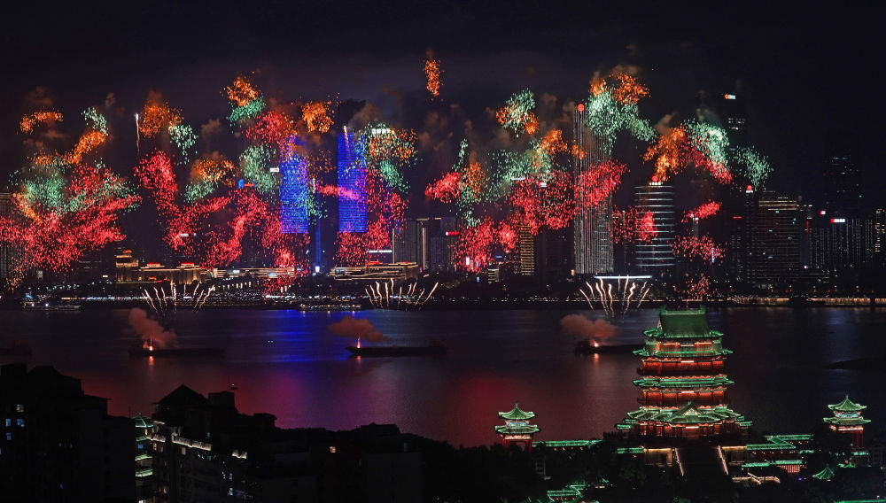 10月1日,2025年南昌市国庆烟花晚会在江西省南昌市赣江老官洲水域举办。新华社记者 万象 摄