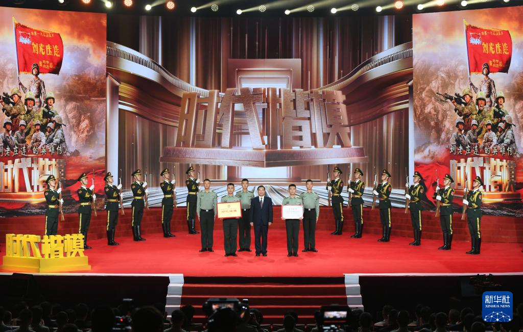 在“时代楷模”发布仪式上,陆军某合成旅合成二营装甲步兵一连(“刘老庄连”)官兵代表领取“时代楷模”奖牌和证书(9月29日摄)。新华社发(华夏 摄)