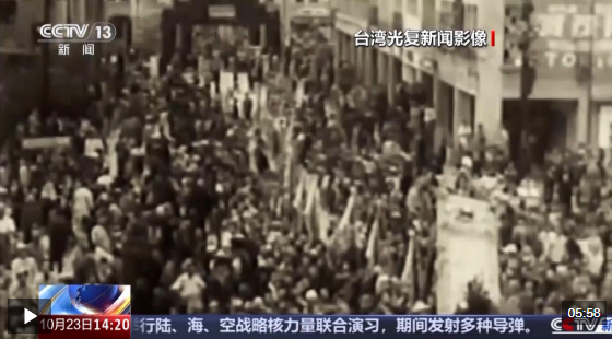 抗日将士杨宣诚之孙、台湾世新大学副校长 杨盛昱:“张灯结彩喜洋洋,台湾光复不能忘”,这首歌我们从小到大基本上是会唱的。当时真的街上是张灯结彩,人们是自发自愿、非常动心动情地在庆祝这一天。