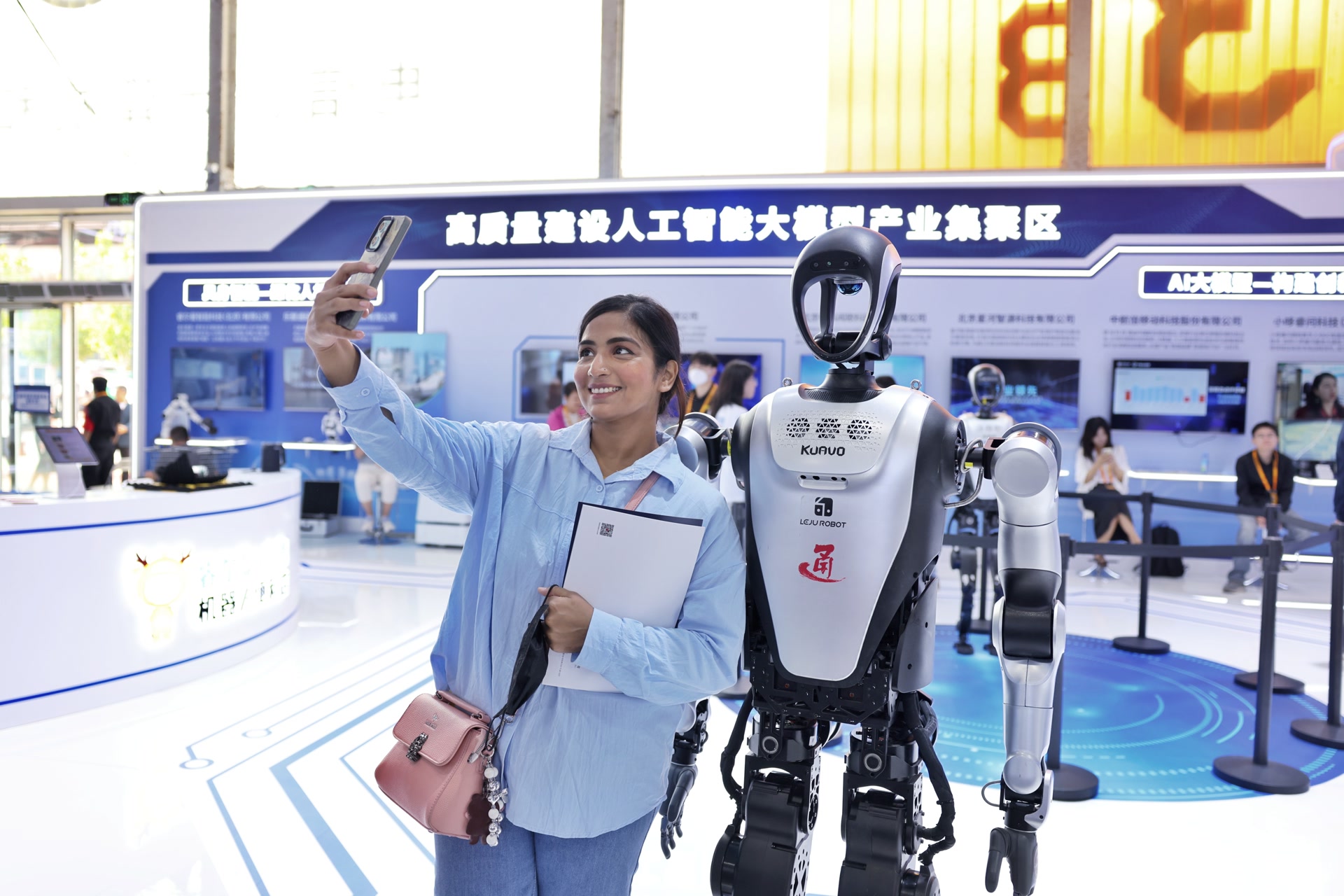 服贸会上,外国观众与机器人合影。 潘之望 摄