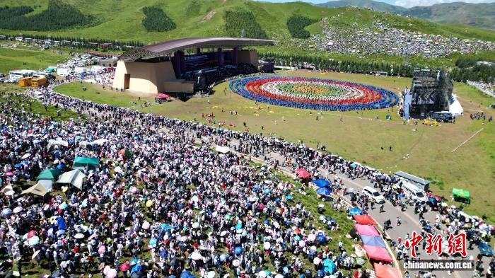 2024年8月4日,第22届九色甘南香巴拉旅游艺术节在甘肃省甘南藏族自治州当周草原开幕。图为开幕式现场锅庄舞表演。(资料图)九美旦增 摄