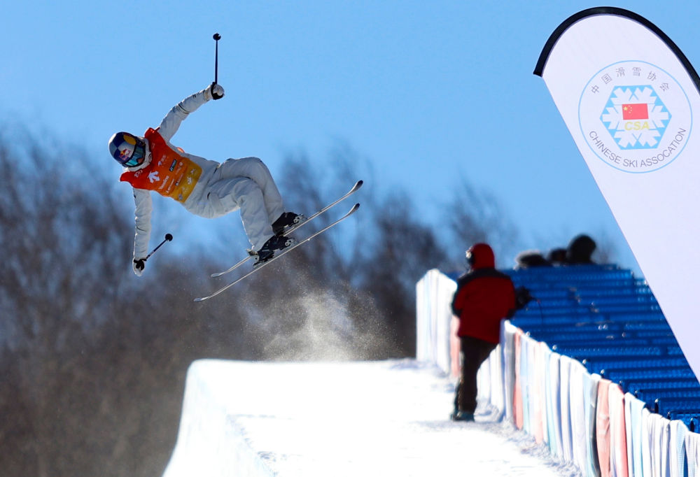 2月23日,亚军中国选手齐广璞(左)与队友、冠军李天马在自由式滑雪世界杯(北大湖站)空中技巧男子决赛后。新华社记者 颜麟蕴 摄