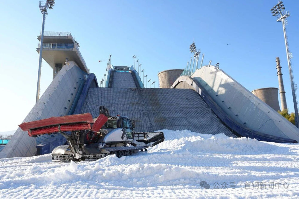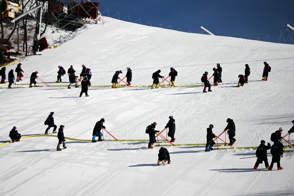 2022年1月28日,工作人员在国家高山滑雪中心雪道上进行冰状雪制作。新华社记者 张晨霖 摄