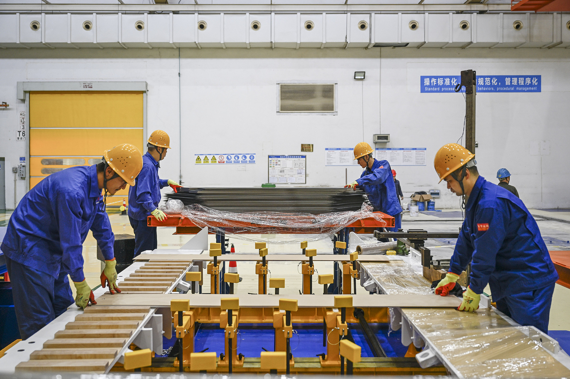 工人在组装新能源变压器硅钢片