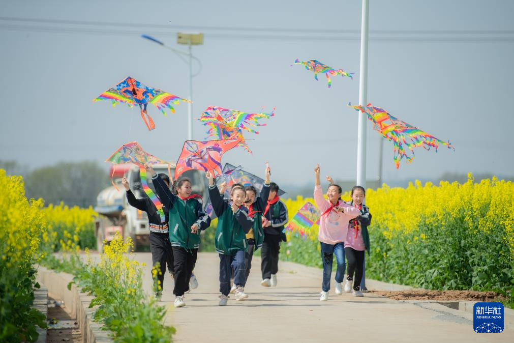 2023年3月10日,孩子们在浏阳市永安镇丰裕村放风筝。新华社发