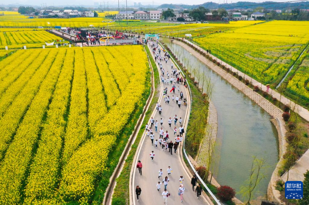 2024年3月22日,浏阳市永安镇丰裕村举办的油菜花节,村民和游客参加花田乡野跑活动(无人机照片)。新华社发