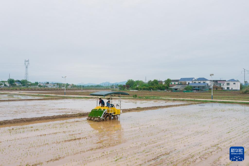 2024年6月19日,在浏阳市永安镇丰裕村改良后的耕地上,村民操作机械插秧。新华社发