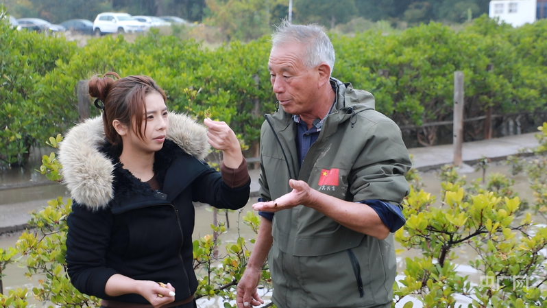 吴昌根女儿今年加入保护红树林队伍,图为吴昌根在给女儿讲解红树林育苗知识(央广网发 罗凯文 摄)