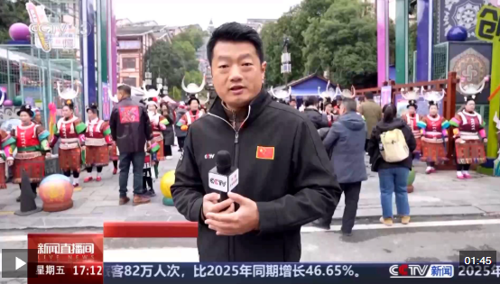 总台记者 尹平:在位于贵州省黔东南州凯里市的绣里淘非遗集市门口,当地群众吹起芦笙,摆起拦门酒,用自己丰富多彩的民族文化和琳琅满目的非遗技艺迎接新年,欢迎大家来过新年。