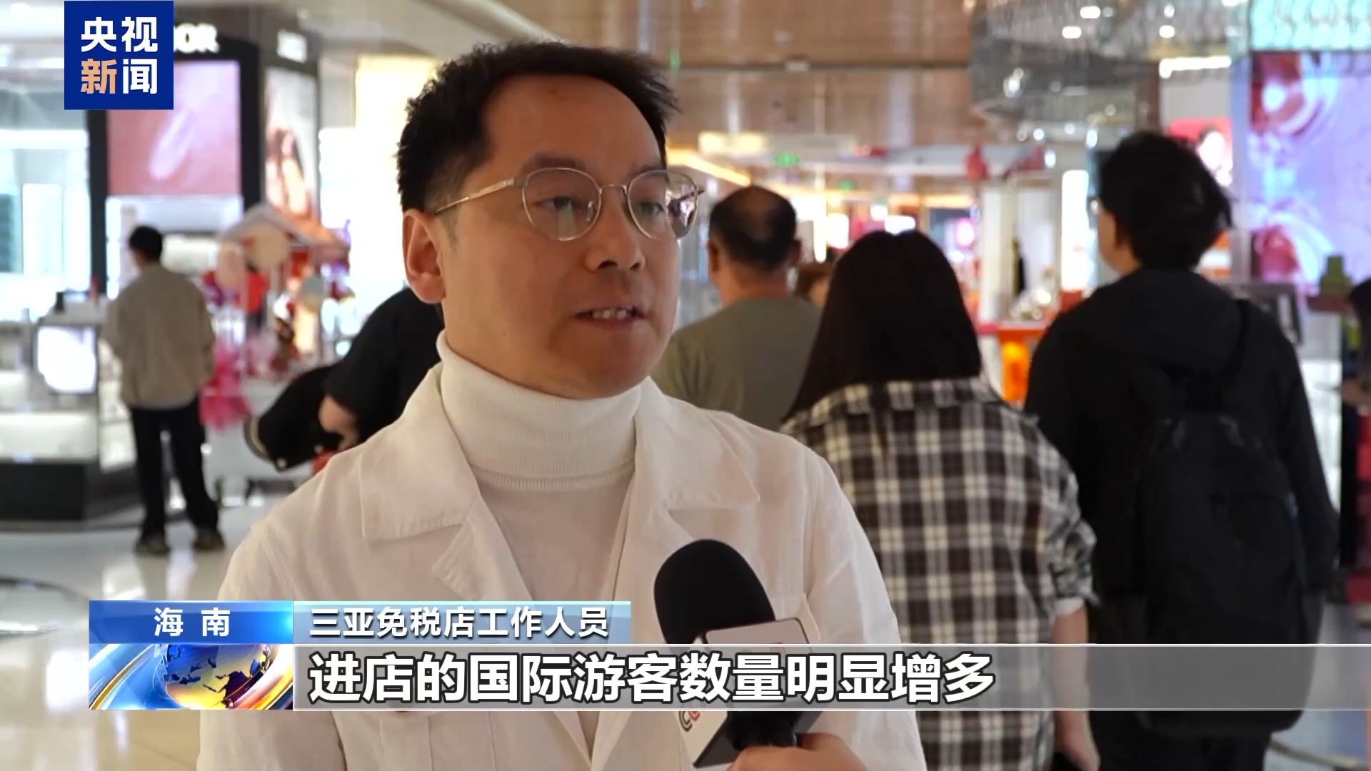 三亚免税店工作人员:新政实施以来,进店的国际游客数量明显增多,尤其在多国人员入境免签政策加持下,来自东南亚、北美、欧洲地区的游客越来越多,增幅明显。