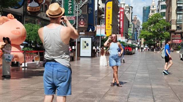 题图来源:2025年夏天,外国游客在南京路步行街上留影。
