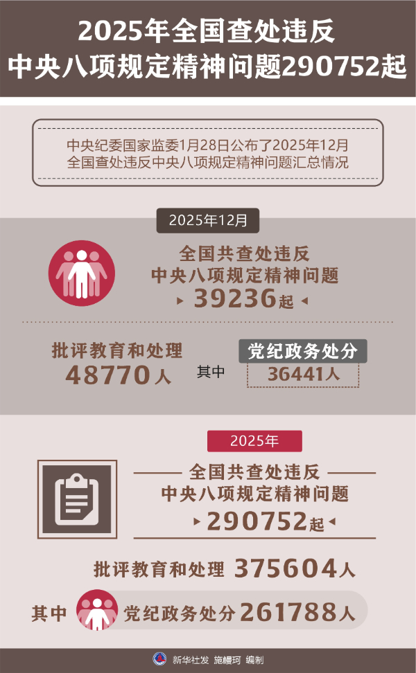中央纪委国家监委28日公布了2025年12月全国查处违反中央八项规定精神问题汇总情况。当月,全国共查处违反中央八项规定精神问题39236起,批评教育和处理48770人,其中党纪政务处分36441人。2025年,全国共查处违反中央八项规定精神问题290752起,批评教育和处理375604人,其中党纪政务处分261788人。