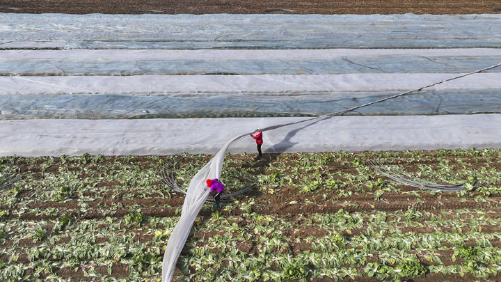 2025年12月11日,在山东省东营市广饶县李鹊镇,农民为作物覆盖防寒无纺布,应对寒潮(无人机照片)。