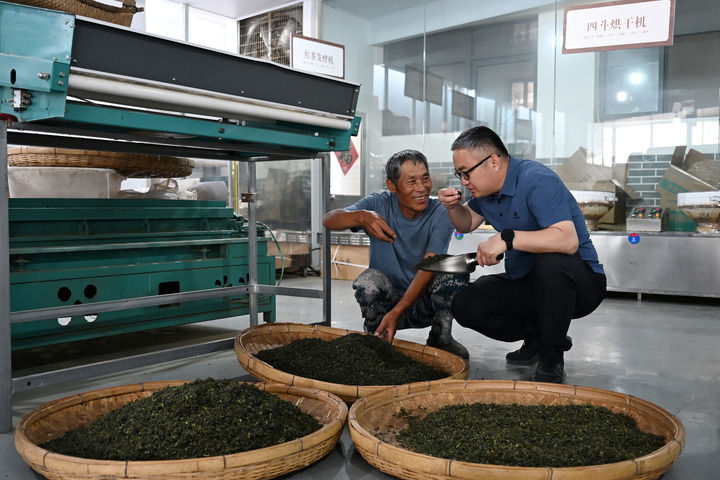 2025年5月25日,在山东省日照市五莲县丁家楼子村,第一书记郑勇山(右)在村里的茶叶合作社查看茶叶品质。