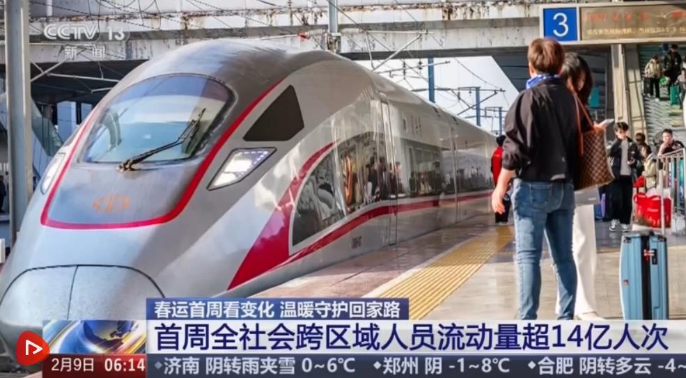 2026年春运2月2日拉开帷幕,到2月9日是第八天。据此前综合研判的数据,在今年春运40天的时间里,全社会跨区域人员流动量将会达到95亿人次,预计创历史新高。数据显示,春运首周,预计全社会跨区域人员流动量累计超14亿人次,日均超2亿人次,比去年同期增长2%。交通运输部预计,2月14日前后将达到春节前客流峰值。