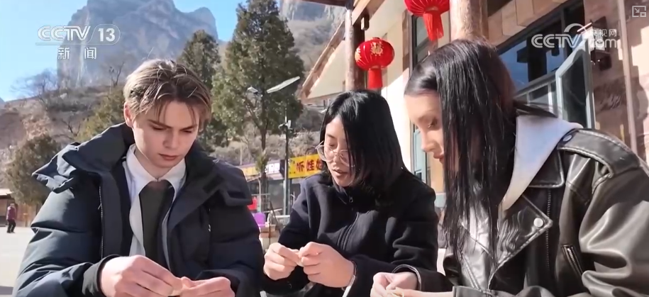 此外,外国游客还兴致勃勃跟着村民一起擀饺子皮、学包饺子,亲手体验这一充满团圆寓意的传统习俗。