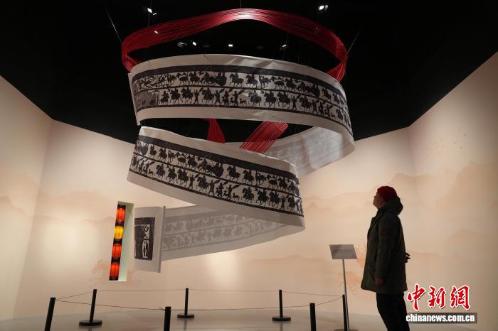 2月19日,安徽博物院展出的以汉代车马出行拓片图为核心创作的艺术装置。中新社记者 张俊 摄