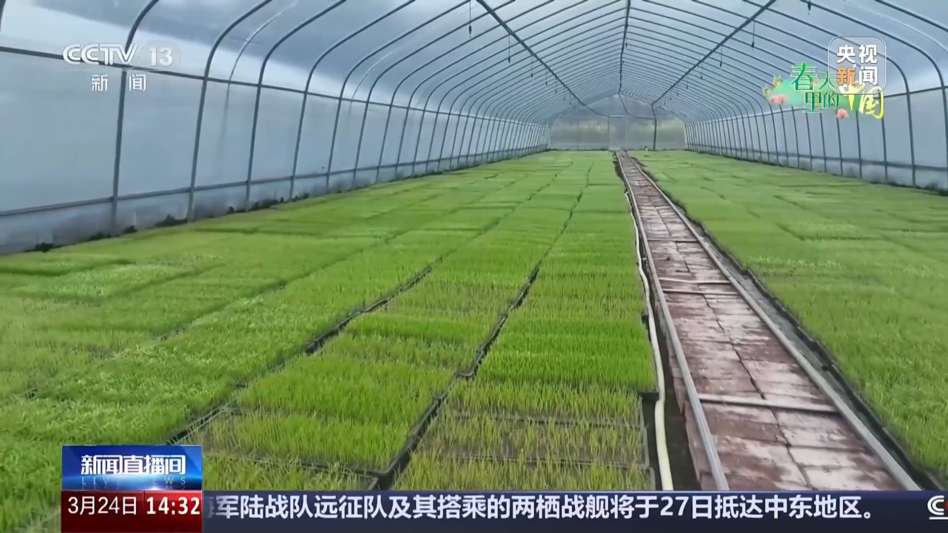 在另外一处育秧大棚,工人将播种好的种谷搬上机器,育苗设备匀速运转,让秧苗均匀接受光照和水分。相比传统的大田育秧,设施育秧不仅节省人力和土地,还能精准控温,大幅提升育苗效率和秧苗质量。