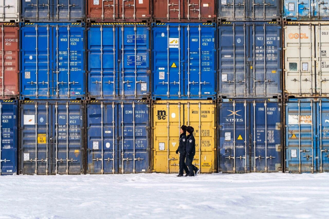 乌鲁木齐铁路公安处的民警正在货柜存放区进行安全巡视。