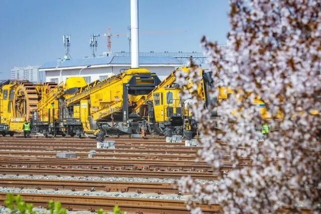 春风拂过钢轨,繁花映照着中国铁路西安局集团有限公司工务机械段的大型养路机械。这些“钢铁卫士”整装待发,在春日暖阳中守护线路安全,让每一趟列车都能驰骋在最美的春天。