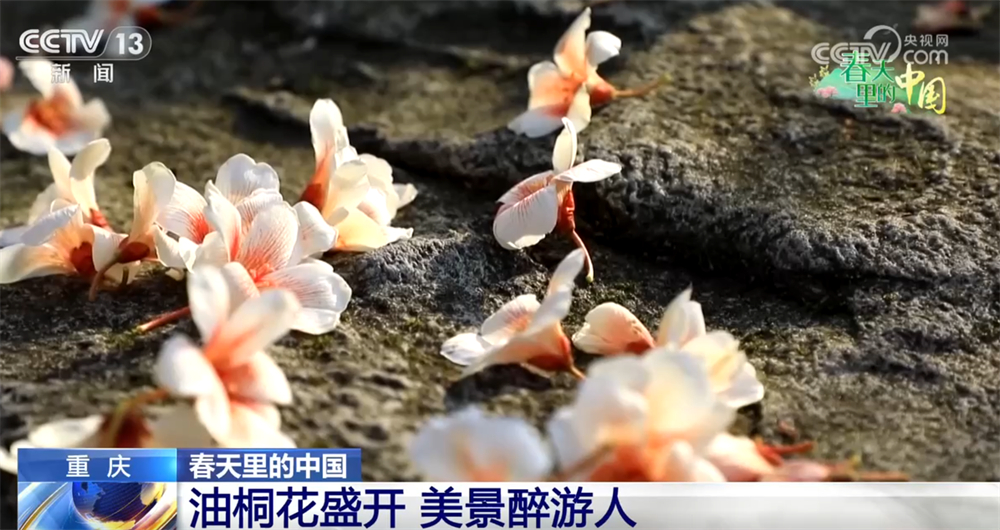 荣昌区古佛山的半山观景平台周边是野生油桐的集中分布区,从空中俯瞰,大片油桐花竞相绽放,开得格外繁盛。凑近了看,一簇簇白里透红的花朵挂满枝头,花瓣温润柔美;微风轻拂,轻盈的花瓣随风飘落,为山间小道铺上一层洁白花毯。前来赏花的市民游客或驻足拍照、或穿行花间,尽情享受春日美好时光。