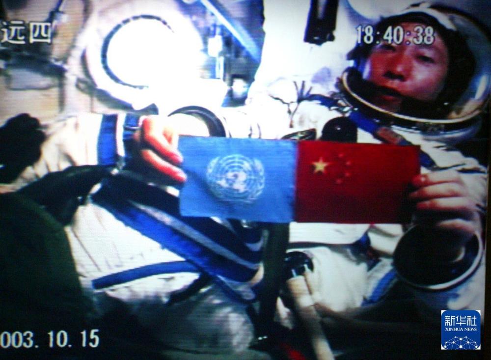 2003年10月15日18时40分,航天员杨利伟从太空向世界各国人民问好,并在舱内并列展示了五星红旗和联合国旗(摄于北京航天指挥控制中心大屏幕)。新华社发