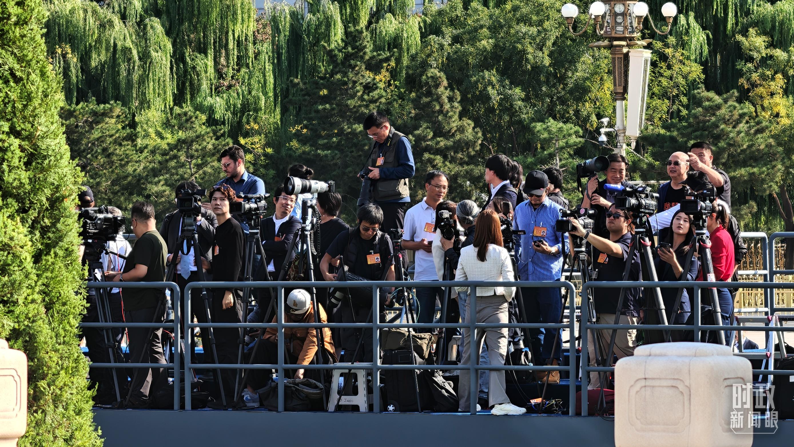 9月30日,天安门广场上现场报道的记者。(总台央视记者鄂介甫拍摄)