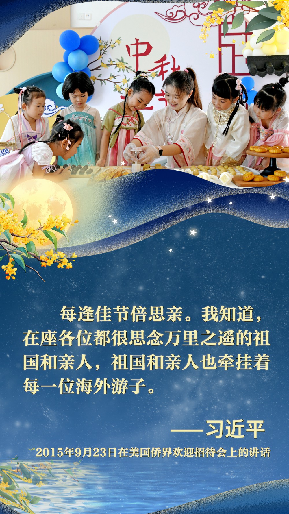 2015年9月23日,中秋佳节前夕,习近平总书记在西雅图出席美国侨界欢迎招待会。他为参加招待会的同胞们带去了来自家乡的月饼,并热情地“欢迎大家常回家看看”。