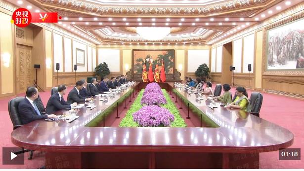 10月14日上午,国家主席习近平在北京人民大会堂会见来华出席全球妇女峰会的斯里兰卡总理阿马拉苏里亚。