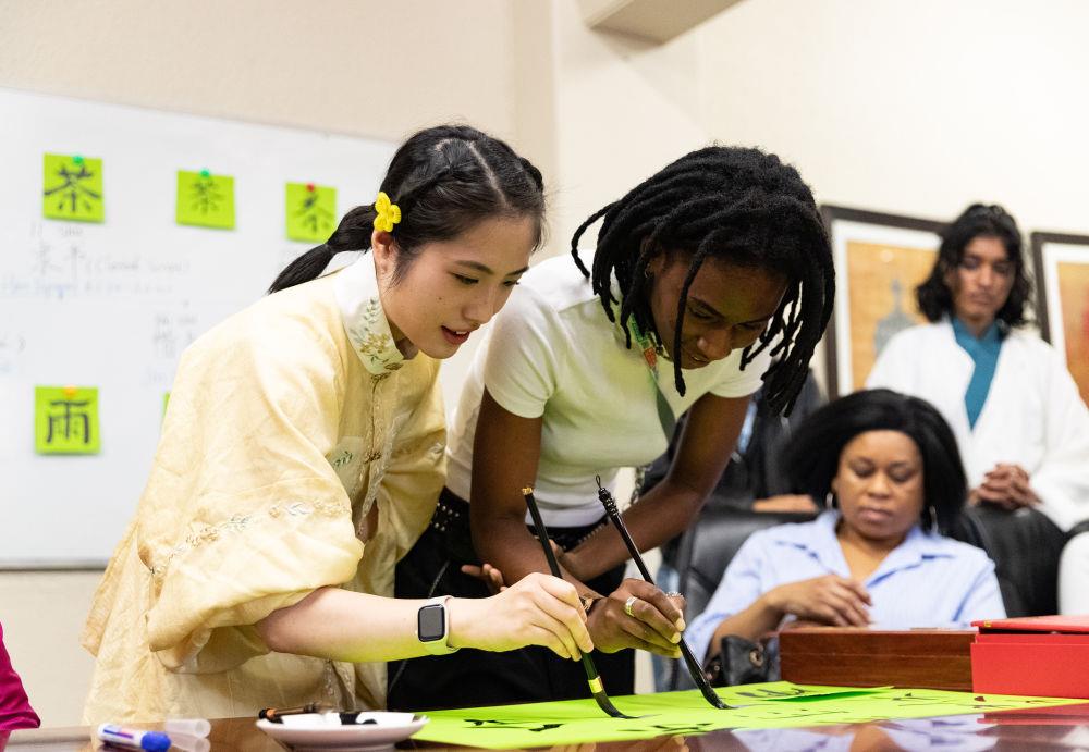 2025年4月17日,在南非约翰内斯堡,学生与孔子学院志愿者在“国际中文日”活动上写毛笔字。