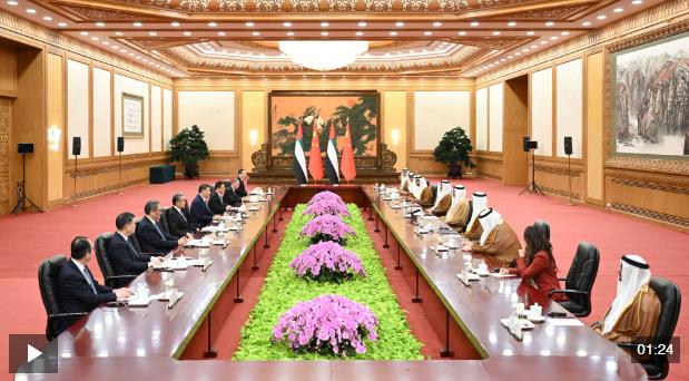 哈立德说:“主席阁下,阿联酋和中国的关系历史悠久、根基深厚。阿联酋高度重视同中国的伙伴关系。我们致力于进一步推动两国关系向前发展,开拓更广阔的前景。”
