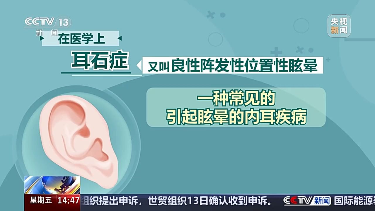 首都医科大学宣武医院耳鼻咽喉头颈外科副主任医师 丁秀勇:耳石症是因为我们在耳朵里面一块儿小的石头(碳酸钙结晶)脱落了,脱落到了一个异常的位置,当石头在耳朵里流动的时候,就会出现眩晕的感觉。